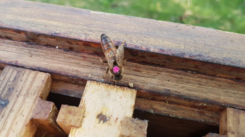 Die Königin haben wir direkt mit einer Umweltfreundlichen Signalfarbe markiert, um sie auf den vollen Rähmchen später besser wiederfinden zu können.